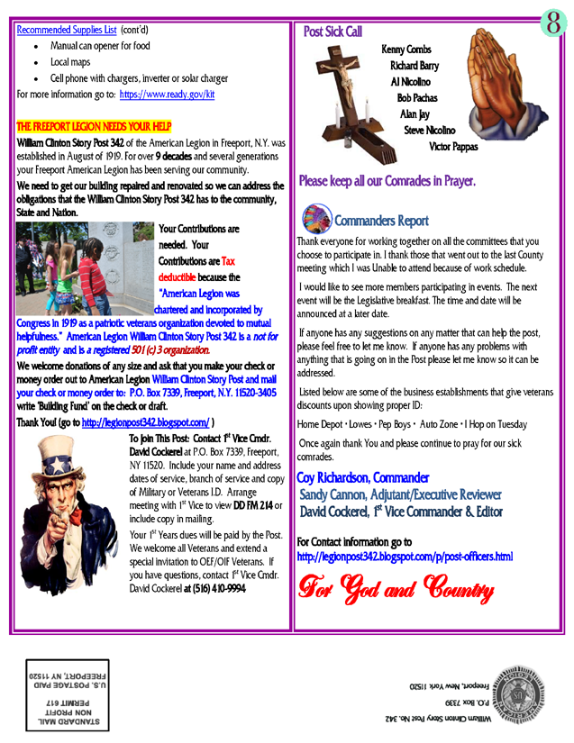 The Dugout is published once a month with article deadlines the third Wednesday of every month. If you have articles of interest concerning Veterans, Veterans Health, Military history or Veteran current events please submit them to: 1st Vice Cmdr, William Clinton Story Post No. 342, P.O. Box 7339, Freeport, NY 11520.